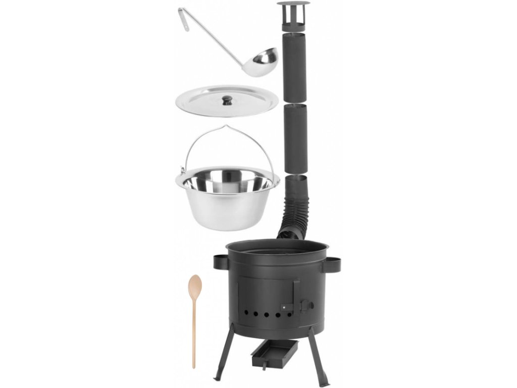 💡 Rychlé info: ✔ Materiál: Nerezová ocel, dřevo, ocel ✔ Objem: 13 litrů ✔ Průměr: 36 cm ✔ Výška: 51 cm ✔ Vhodné pro: Vaření na ohni, dřevo ✔ Obsah balení: Kotlík, poklička, naběračka, vařečka, kotlina s komínem