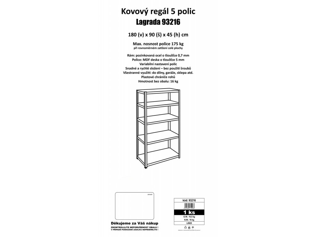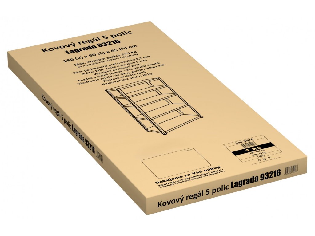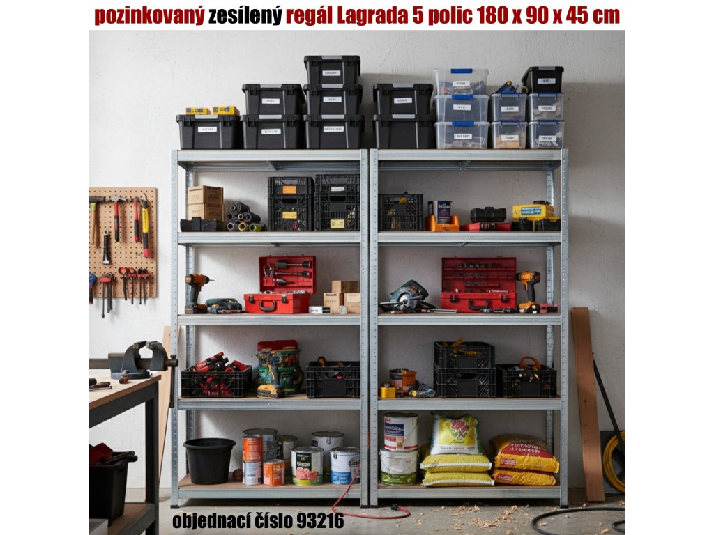 Kovový regál Lagrada 5 polic 180 x 90 x 45 cm představuje univerzální a zesílený policový regál, který je navržen pro maximální odolnost a dlouhou životnost. Jeho konstrukce z pozinkované oceli o tloušťce 0,7 mm zajišťuje vysokou stabilitu a ochranu proti korozi, což oceníte zejména v náročnějších podmínkách garáže, dílny, sklepa nebo skladu. Pět polic z MDF desky o tloušťce 5 mm nabízí nosnost až 175 kg na jednu polici při rovnoměrném zatížení, což umožňuje bezpečné uložení i těžších předmětů.