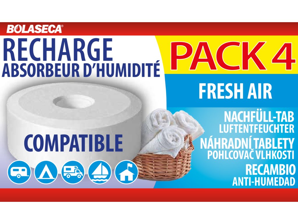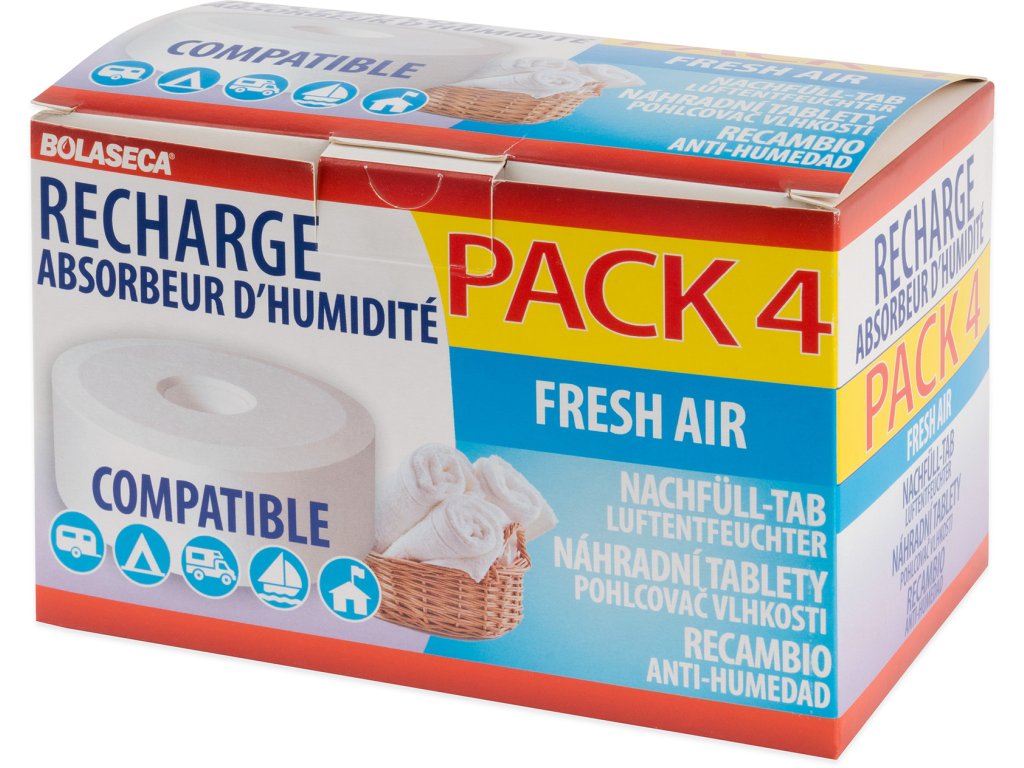 Náplň do pohlcovače vlhkosti Fresh Air obsahuje 4 tablety do pohlcovače vlhkosti po 450 g, určené jako doplnění do většiny pohlcovačů vlhkosti. Každá tableta má rozměr průměr 10 cm a výšku 3,7 cm; aktivní složkou je chlorid vápenatý, proto dbejte na bezpečné zacházení dle pokynů.
