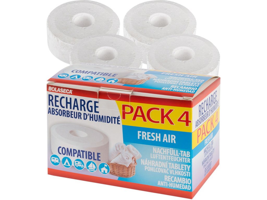 Náplň do pohlcovače vlhkosti Fresh Air – 4×450 g tablety je sada náhradních tablet určená jako doplnění do většiny pohlcovačů vlhkosti. Balení obsahuje 4 ks tablet, každou o hmotnosti 450 g; rozměr tablety je průměr 10 cm a výška 3,7 cm.